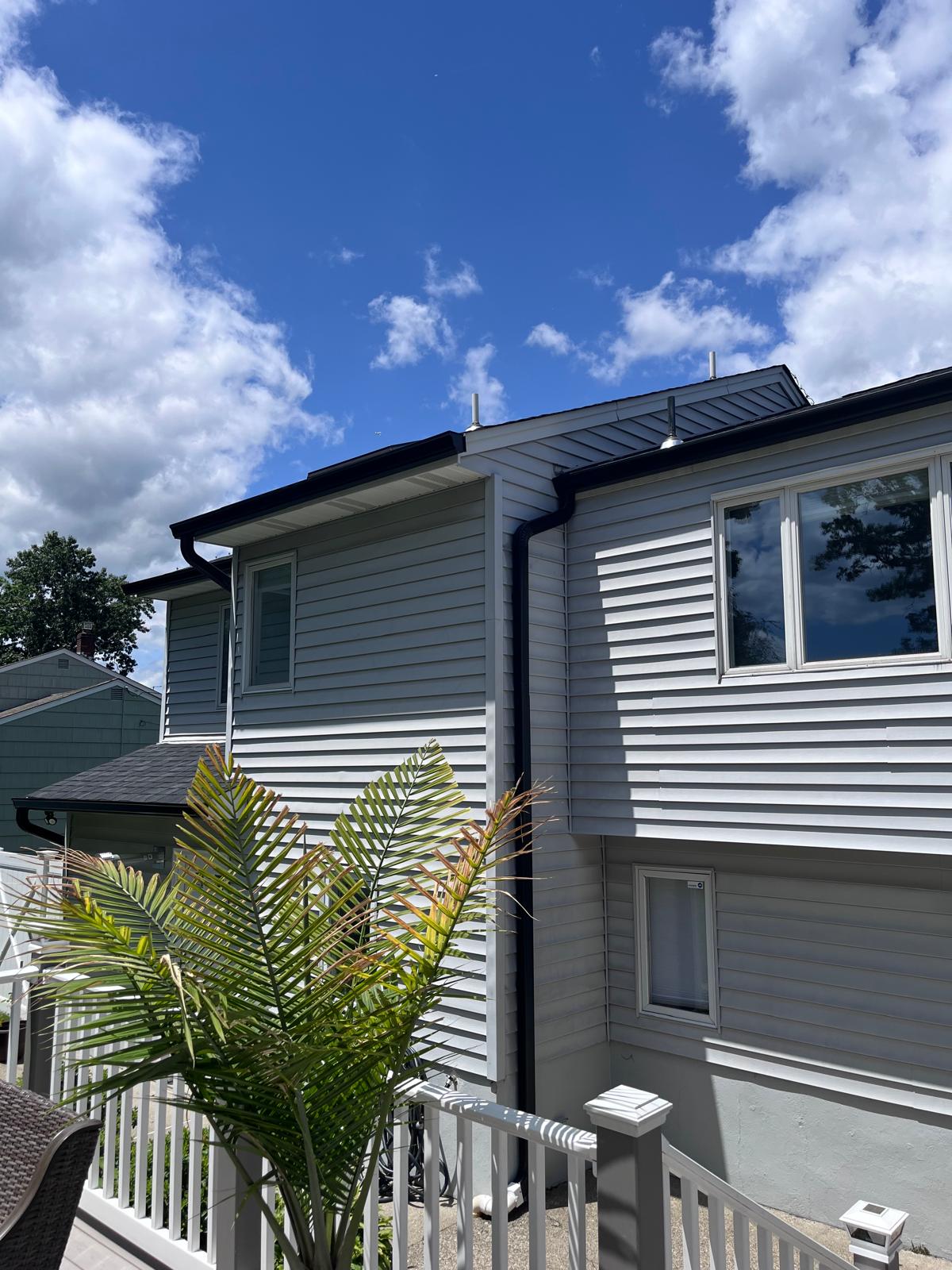 The property features newly installed gutters and well-maintained siding, enhancing both functionality and aesthetics.